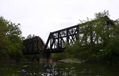 So anyway we were enjoying the day. It had started to clear up a bit, I had cracked a beer, and sipped it as we passed through a long slow part of the river. Next up was a riffle formed by a long-ruined dam that had been put in something like 200 years ago to provide power for a flour mill. Peter and I surfed the eddies below and Rodman took some photos and heckled us, especially Peter when he dipped a gunnel under the current flowing over the old dam. The old, abandoned Water Street bridge spans the river just over the old dam, and I remembered another evening on the Mahoning.