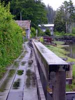 There’s no beach to speak of, but there’s a boardwalk that follows the shoreline, providing access to the houses for about half a mile, or perhaps a little more, around the bay. This makes an interesting walk, and near the end a trail through the woods leads to the gravel road from Port Hardy, which takes you back to the docks.