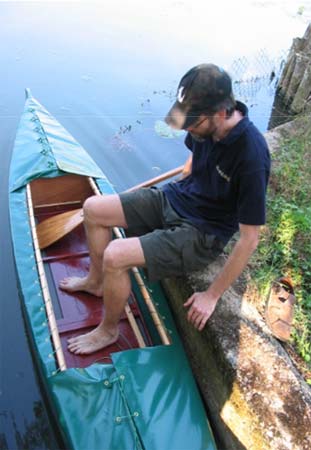 To put the boat together, you assemble the frame, then lay the foam pads in the bottom of the hull sack. Forward, the first 10” or so of the deck is closed over to keep the worst of the water out of the boat if a wave breaks over the deck. Aft the boat laces all the way to the end. You slip the front of the boat into the sack, pull it tight and make sure everything is more or less lined up. Then you press the back of the boat down into the sack and the decks and side panels lace up with 1/8” polyester line.