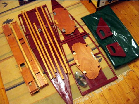 The boat disassembled: 18 parts and a bag of hardware. The first time I put it together, it took just under 30 min. and about the same to take apart. It will pack into a triangular bag about 5’6” by 25” by 8” thick. The next project will be to make bag and build some kind of cart that is dismountable to go inside the boat and can be used to carry both the bag and to help out on long portages with the boat together.