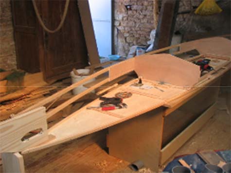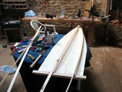 The rib stations are in 3/8” plywood and are set into a slot to hold them in place fore and aft, and then fixed in the slot with a small sliding bolt like one would use to lock a door. The two bottom pieces were fixed together using two beams laminated of four pine strips bolted through the bottom on both sides of the join and at the ends resting on the cross members that form the slots for the rib stations.