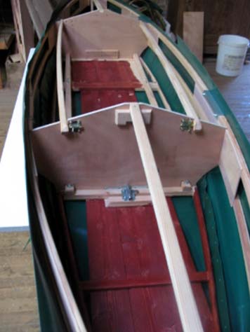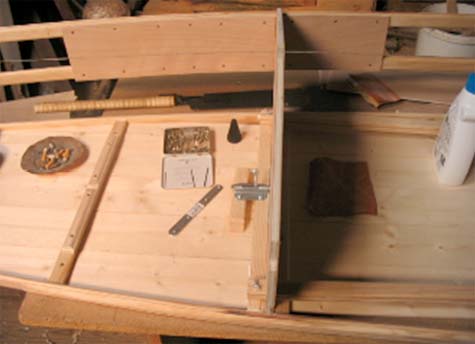 The side beams were glued up in place on the boat (three strips of the pine each) and then joined together with pieces of 1/4” ply, glued and screwed. At the ends the beams were reinforced with small pieces of 3/8” hardwood to provide a strong place to help take the strain of the bolts that hold the sides to the end pieces.