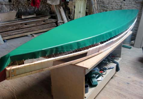 The skin was another story. I built a skin-on-frame kayak a while back, and the heavy awning canvas I stretched on a pine and oak frame and then painted worked great for several hundred miles on rivers around my home town in Ohio. But I didn’t think I could fold painted canvas repeatedly and expect it to stay strong and watertight. At Yostwerks.com I discovered Thomas Yost was using pvc cloth reinforced with polyester and so I tracked some down here in Cologne, Germany before leaving on vacation. It ran me $100 for a piece 14 ft. long by 8 ft. wide. I ended up with a lot of little scraps and a piece something like 8 ft long by 4 wide.