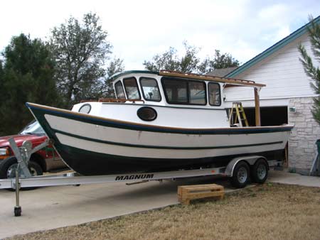 You may remember that we were documenting the construction of Jim Ward's Tolman Jumbo in these pages. Lately there have not been so many updates because - First, Jim spent the summer fishing in Canada and Second, Jim took the boat home to Dripping Springs, Texas to complete the project. We stopped by there the other day on the way to visit the grandkids and took this picture: