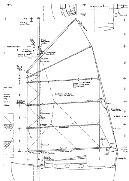 have a gaff cutter rig but for those who want to cruise in real comfort with as little work as possible the Chinese Junk rig with its self tacking single sail and ease of reefing is a very attractive alternative. I have drawn a complete set of plans that includes the mast step, the mast and battens including the head and foot battens. The rig is one that will give quite reasonable windward performance and will outrun most conventional rigs reaching and running.