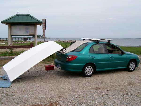 I like the way he's figured out how to get his boat up on to the racks of his car. A very DuckWorks mind at work here. I wonder how I can adapt his idea to my VW van? Getting too old to lift even the 65lb PUD-g, 6 1/2 feet in the air to get it up there by myself.
