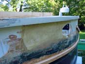 I did draw lines on the hull after initial fitting, though, so I could drill pilot holes from the outside of the boat. That way I couldn’t miss the wale. Once the glue cured, I removed the old wales. This is easiest if you cut a lot of kerfs with a circular saw and chisel out the waste. Be sure to cut a LOT of kerfs, though, or the wales’ grain can split right down into the plywood. I had to fill a couple holes because I got lazy with this. The belt sander takes off the last bit, down to clean wood.