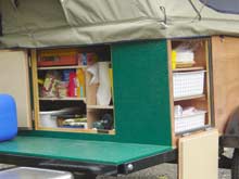 It has a kitchen/galley area on the front that includes organized, shelved storage compartments and counter space. In the rear is a large general storage compartment for bulkier items and storage containers. |