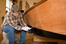 Hull components are sealed with an epoxy coating that prevents watersoak, increases abrasion resistance and simplifies long term maintenance. The plywood hull is held together with concave shaped beads of thickened epoxy and strips of fiberglass tape applied to the exterior seams. The hull is constructed by lacing together thin plywood panels with plastic ties. The ties are gradually tightened to hold components in position while a concave shaped bead of thickened epoxy is applied to hull seams, often called “stitch & glue” or “tack & tape”. Vertical compartment bulkheads are installed at the same time to secure hull panels at the correct angle. All exterior seams are rounded and fiberglass tape seals and reinforces the exterior chine seam and the bow and transom. Graphite is combined with epoxy to cover the bottom with a tough, very slick and abrasion resistant coating, which allows the boat to be dragged over launch ramps, parking lots and gravel beaches. The epoxy/graphite mixture is applied around and above the chine seam to form a waterline.