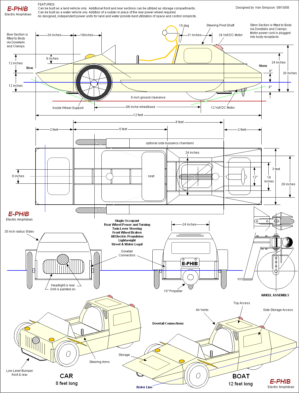 At this writing this is more than a design exercise, as I intend to build E-PHIB over the winter months. I have selected the power plants, batteries, controllers, guages, and body/hull materials. Only the wheels and tires remain to be reasearched.