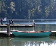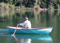 My friends hadn't arrived for the "one and two up" photo shoot, so I took the O&P out for a spin. This is one easy to row hull. I have to say this is the best rowing hull of mine so far, and tracks like an arrow. I added a bit of a skeg to the end of the keel seam mainly for looks, but it was like putting feathers on the end of the shaft. It also acts as a brake when doing spins by counter rowing. Once you stop counter rowing, the hull rotates another three feet and stops. So I started down the lake and was surprised to notice after a few minutes that I was already approaching the shore at the other end. I did two full circumnavigation's of the lake and went back to the dock to wait for my friends.