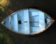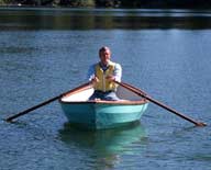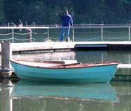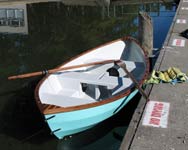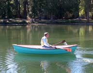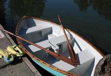 On this boat, and my next boat, the 12ft Granville Bay, the "two up" rowing position is at the forward seat. The Granville Bay and the O&P, both have reduced volumes in the ends, so the people weight has to be spread out over the hull. More so than my Pram designs, which have a lot of volume in the stern areas. After Nick moved the oars to the forward position, I helped Edie get into the boat, and off they went.