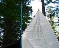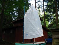 I had been thinking about using the sail as a "Gaffer", after talking with Bob Patterson at Neil Pryde Sails. With the head at a steeper angle than most sprit sails, this was a possibility. I had an old aluminum sailboard mast that I put a slight kink in, while sailing down in the Columbia Gorge, and got flipped end over end. I only have to get some boom hardware for it, and it's off to the lake. I actually like the looks of the sail with the gaff rig, and it's a lot easier to get the sail up and down while in the boat. I don't have to worry about the snotter block being in the way to catch on each of the luff ties, as I host the sail. I can rig at the dock, and set sail away. I have an idea of how to make the "gaff shoe", and will do a story when the details, and parts used, are fleshed out.