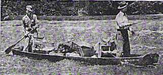 The traditional Ozark boat is in some ways better than the aluminum canoe. For one thing it carries a huge load, being 20' long, 4' wide, and having a dead flat bottom. It is a drifting barge. Godsey gives the basic use: load with fishing guide and "sport" and gear to float 125 miles from Galena to Branson, Missouri, (first home of the mythical Jed Clampett), in five days. No motor, just a paddle for the guide to steer with. At Branson it all got shipped back to Galena (just 24 miles away by land) by rail for the next trip. In the old photos the amount of gear carried is enormous. The boats have seats in the ends but the photos show the people sitting very comfortably in canvas director's chairs.
