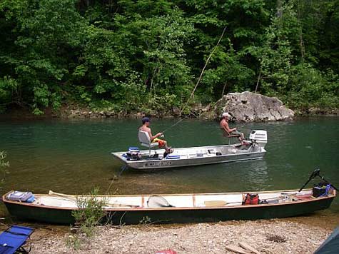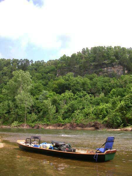 Kyle Kosovich in Springfield, Mo, built the prototype. He knew the history of the boats and is using his just as the old ones were used, (which is pretty unusual). Don't even ask me about putting power on such a long light hull. You are on your own there. Remember these were never used at high speeds or in big open water. They are slow stream drifters. Here is Kyle's boat in the very waters the original boats floated: