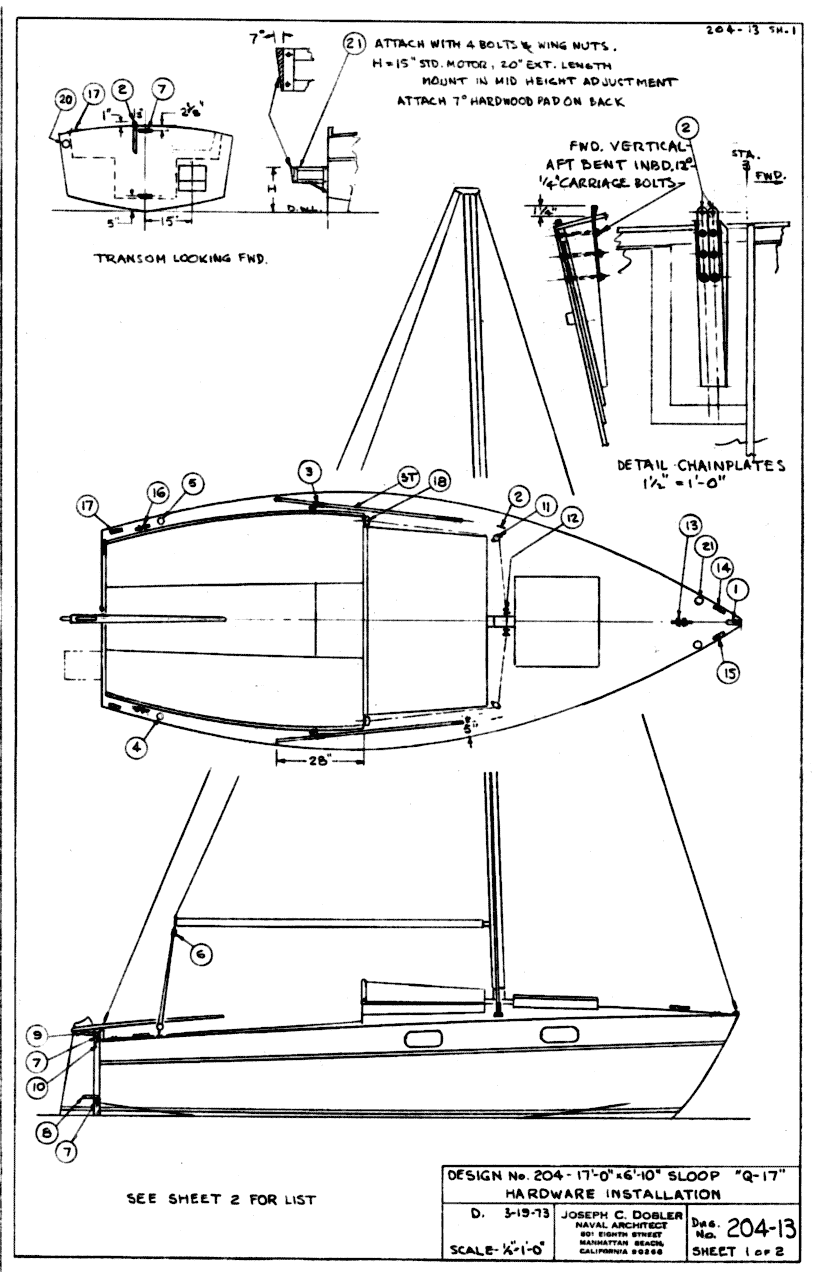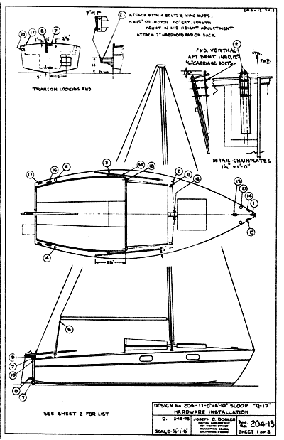 The Q—17 is a plywood sloop designed for the amateur builder. The construction is Taped Seam with FRP sheathing, which means that it is permanently tight and a strong, one piece structure. All parts are detailed so that they may be prefabricated. No lofting is required. No strongback or jig is required and there is no attachment to the floor.