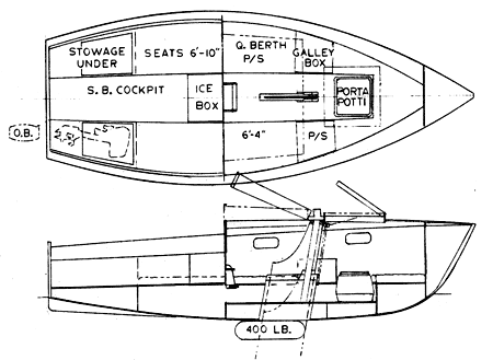 It is also outstanding in looks, and as roomy as it is possible to make a cruising boat of it’s size without it becoming a tub. Length is 17’, beam 6’ 10”, draft 1’ 7” with drop keel up, 3’ 7” with keel down. Weight of hull and rig is about 700 lb., ballast keel 400 lb., design displacement 2010 Lb., or capacity to design water line, 910 lb., approximately. Construction is the simplest possible, using 3/8” plywood and fiber-glass with bulkheads taking the. place of frames, attached with fiberglass tape, to reduce fitting problems. There are no internal stringers, the seat and bunk fronts form a girder which stiffens the bottom for trailer loads. The rub rail at the lower sheer doubles as an .external stringer. In spite of its small size, this boat has a really surprising amount of room. The raised deck design is simpler and stronger than a regular cabin, yet roomier; it gives sitting headroom, and the large lifting cabin top and forward hatch give additional room where it is most needed. Bunks can be either forward, or quarter bunks partly under the cockpit seats, as there is a platform on each side 11.5” long. Cockpit seats are 6.5” long, for those who prefer to sleep in the open. The keel is raised with auto jack. The keel trunk ties into the roof for stiffness and to support the mast. Detailed instructions are included with the plans.