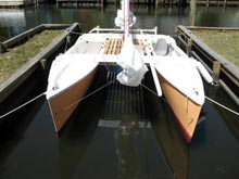 Overall, the feel of the boat is lively, but not at all squirrely, which I attribute to the long narrow hulls. The steering is very light and responsive once the rudders are in their down position. There's a modest amount of weather helm, which does not increase much in the puffs. Steering takes a little getting used to, because the steering lines have to be pulled in different directions, depending on which hull you steer from.