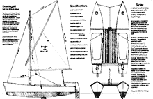 Because I wanted a simple-to-build, inexpensive boat, I designed a sprit-sloop rig-- an old-fashioned, low-tech approach, unusual for a potentially fast multihull. This was to be a boat for anxiety free cruising, so I drew a modest sail plan of 140 sq. ft. For comparison, a Hobie 16, which is about the same length, carries almost 80 sq. ft more sail, and is lighter. But if it capsizes, it can be righted by its crew, and my cat can't.