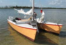 couldn't understand this gap in the design spectrum, and I still can't, because there are plenty of tiny trimarans like this-- both manufactured boats and plans. But tris are poor load carriers compared to cats, and they are less suitable for pitching a tent on deck-- a necessity for comfortable beachcruising these days, since it's gotten hard to find a place ashore to pitch a tent.