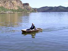 Early in January of this year the TOTER had its maiden voyage on a nearby lake. It immediately impressed me. As I paddled out from the loading area, I already felt comfortable in the small space it has to offer. It paddled effortlessly, and moved quickly. The seat was too high though, placing the paddle at an odd angle, and I knew I would have to make a change there. Next came the time to lower the motor into the water. This proved to be a challenge. It required I kneel aft, raise the motor out of the rear section and manually lower it into the water. It weighs about 12 pounds, and requires upper body strength, a commodity I apparently do not have. Another change required. Once under way all went smoothly, and after an hour of sloshing around I got to respect the little boat. No leaks, quite stable, good battery life, easy to turn, and above all, FUN. It travels with the little trolling motor at hull speed, about 5 mph.