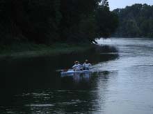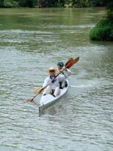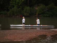The solo adventure class started at 7:00am and our group (the tandem adventure class) was to start at 7:10am. We had a problem right at the start. We broke our rudder mechanism off putting the boat in the water. We frantically started duct taping the rudder assembly back on in hopes that it would hold up until Smithville which was about 24 miles away. We made it about 50 yards before it came off. We pulled over to re-evaluate. I thought some zip ties might help so we had some brought down to us and we tried the fix. We only made it about a mile before that failed. We decided to tie the rudder up and go without it all the way to Smithville. This proved to be more difficult than I expected as the boat didn't track well at all and we were all over the river. We were not able to hold any kind of hull speed which was very frustrating.
