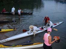 The rest of the night was spent trying to keep moving but we found ourselves stopping more frequently as we were both tightening up. The first 24 miles without the rudder had taken its toll on my shoulders and Skip's elbows. We kept our stops brief and paddled on. We arrived at the finish in Columbus at 4am and it was a very welcome site. Susie and Tracy were there to greet us. I can't emphasize enough what an excellent job they both did as our boat crew. We looked forward to seeing them at each checkpoint and they took care of us along with offering encouragement. My friend Geoff was in the race also and they went out of their way to take care of him also.