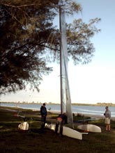 By way of background, the Everglades Challenge is a 300-mile expedition race open to small craft – canoes, kayaks, sailboats, etc. It begins at Ft. DeSoto Park on Tampa Bay and proceeds around the tip of Florida, ending at Key Largo. Competitors must stop at three checkpoints during the race. The requirement that all boats be beach launched from above the high tide mark and the difficulties of getting in and out of the checkpoints are “filters” that limit the size and capabilities of the boats. At one checkpoint you have to go under a low fixed bridge (mast down on the sailboats) with the pilings about 12 feet apart (too narrow for rowing), while at another the entrance is a multi-mile twisting path through mangrove islands where strong tidal currents rule. (Go to www.watertribe.com for a more complete description of the course, rules, and race classes.) We all also have tribal nicknames.