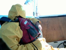 Around 11:30 a.m., we were able to head SSE down the coast, now hard on the wind. The steep chop and uncomfortable motion continue as we departed the land. After a couple hours, I went below for some more rest, but found sleep impossible with Oaracle’s flat bottom pounding and slapping in the chop. The wind would ease and make us think about unreefing, but then pick up again. The direction was also a bit shifty, with Noel noting the hard-on-the-wind course varied from 120 to 180.