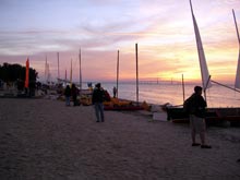 In about 45 minutes, we had rowed out into the sound, gotten the mast and mainsail up, and were proceeding down sound. The wind, which had been light to moderate, began to pick up, and also move more easterly. After about an hour, we paused to put a reef in the main, and then continued into Charlotte Harbor. In 2007, we had encountered some impressive waves that surfed us across. This year, the waves were smaller but it was still choppy as we bounced toward Pine Island Sound. It was also a bit eerie on a no-moon night to be sailing toward Cayo Costo island, past the impressive Boca Grande Inlet, and not be able to see anything of the inlet, which can be subject to strong tidal currents.