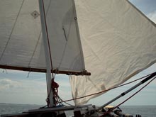 Noel had reached the southern end of Pine Island Sound and pulling out the charts and conferring with the GPS, charted an easterly course skirting shallows and sandbanks to tack toward San Carlos Bay. He had already tacked through most of that tricky area, the wind now having gone ENE. The last fun part was identifying which part of the causeway connecting Captiva to the mainland. We could see where it should be, but couldn’t positively identify the correct span in the early morning light until we were fairly close. It was comforting to check the GPS chart. We squeezed close hauled under the wooden bumpers and headed east for the channel out into the open Gulf. The water at the mouth of the bay was a sloppy chop kicked up by the stiff breeze (we were still reefed), refracted off seawalls and churned by passing power boats.