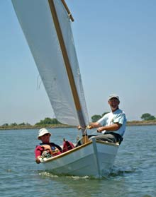 18’ (+/-) sharpie skiff named “Leaps and Bounds” This trip was its first use of the new sail rig. At the helm (right) is guest Roger Allen, curator at the Florida Maritime Museum at Cortez. |