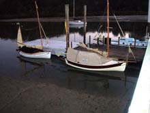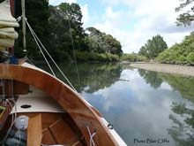 We set off a few minutes behind Jaunty, and sailed around the expanse of rocks and reefs north of Army Bay, then on a long tack through the passage. We started out on this leg wearing T-shirts, but before we had gone far the wind started to rise, and we began to encounter a short steep chop that had Varuna shovelling the occasional bucket full of water over the bow and all over us. We were soon reaching for our waterproof jackets and by the time we were ready to tack again we were very glad to have them on. The wind continued to rise and soon the bowsprit was pointing skywards one moment, and then plumeting into the trough of the next wave a moment later. We tacked too early, and the outgoing tide carried us back towards the headland we were trying to round, the next pair of tacks were not much better and it seemed to take forever to get out of the rough area at the southern end of the passage. When we did, the waves moderated a little, but the wind was now gusting very strongly, and the bailing wench was busy. Varuna as usual handled the conditions magnificently, but we were approaching the edge of our comfort zone. Jaunty was still ahead of us whenever we crossed tacks, and looking very small and vulnerable as we tacked towards our destination. We took one long tack away from the peninsular, and crossed much closer to Jaunty on the next one. I thought we had done well, until later when Blair told us he had shipped a lot of water over the gunwhale, and had stopped to bail out and put in a reef. As the day died we got closer to the mouth of the Weiti River on which Stillwater is located, the wind started to drop a bit and the waves died down. We were very happy to be able to heave to and drop the sails alongside Jaunty when we reached the river mouth, and we motored together into the peace and calm of the river. A mile or two upstream we pulled in and went ashore on the boatramp near the Stillwater Boat Club. It was 8pm and there were a few members having a drink on the balcony at the club. I wandered over and asked if there was any chance of getting a meal. What a great welcome we got there. Half an hour later we had the boats tied up for the night at the club's loading pontoon, I had a cold beer in my hand, and we were all tucking into superb fillet steaks with mushrooms, salad and chips. They were a bit apologetic that that was the only meal available at that time of night, but we would have been happy with baked beans on toast.