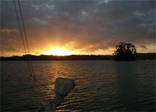 We had a quiet day around the bay, which was slowly filling up as more boats arrived for the following day's regatta. In the early evening we got another phone call. It was Blair again, he had decided to set out a bit later in the morning when the weather appeared to be a bit more settled, sailing up along the coast north of Auckland, which would provide many places where he could find shelter if the weather deteriorated. He found the conditions were OK to continue, but encountered some tough sailing around the Whangaparaoa Passage and across the open water from there to the Mahurangi. When he called he was near Saddle Island, and very much looking forward to getting into shelter after a long and hard days sailing. He was soon in the bay and rafted up alongside us, very happy to get his hands on a hot coffee and some dinner.