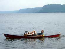 Greg Lindberg sailed in on his creation, ARCEBUS, but also brought a new bit of his wizardry: a pedal-powered kayak. Greg designed the propulsion unit from a bicycle chain drive and a two-bladed propeller. The whole contraption dropped into the cockpit’s “centerboard case.” The result was a recumbent kayak which I found to be just as fun to use as it looked.