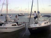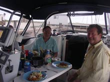Somehow at dusk in that big old bay, Mike saw his tiny sail on the horizin and we got to him and took him aboard. He was not in any distress but it would have taken him all night to beat up into Army Hole. On the way back, Grant Wolf invited Mike and I aboard his Catalina 350 for dinner with his wife Wendy and crew (forgot his name). Thanks, guys, that was a treat!