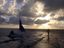 Roger Harlow launches my Ladybug in the first rays of sunshine. This is the last we saw of him. He broke his leeboard in the chop of San Antonio Bay, got a tow from one of the Shearwaters and then motored home. Sorry, Roger, I hope you come back next year.