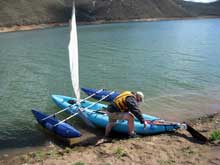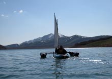 We ditched work early Friday and headed up the canyon only to discover that the reservoir was still closed for the season. There was no ice on it though, and yesterday’s snow had melted, so we ignored the locked gate and carried the boats down the mountainside. The breeze was coming and going randomly as we pumped up the tubes and snapped everything together. I left the fore and back stays detached because I wanted to keep a close eye on how well the baby stays did their job. My other concern was the stiffness of the rudder.