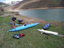 Yesterday’s snow had melted, so we ignored the locked gate and carried the boats down the mountainside. The breeze was coming and going randomly as we pumped up the tubes and snapped everything together. |