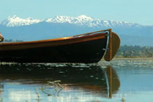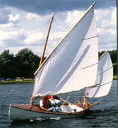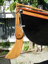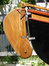 Some time ago there was some discussion on the Duckworks Forum about the relative merits of rudders versus skegs for rowing boats and canoes. This is how John Hitchcock, of Nelson, New Zealand, solved the need for a rudder on his St Lawrence River Skiff, Ferryglide. The rudder is entirely John's design and construction. The skiff was built by John to lines obtained from a maritime museum in the USA, in modern glued-lapstrake construction.