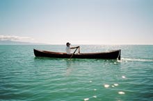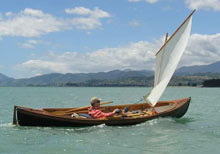 (Photo 11: When sailing John sits in the bottom of the boat with a line over each shoulder to control the rudder. (Credit: Steve Bagley. Running the Waimea Estuary near Nelson.)