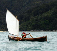 John rowed it for some time without a rudder, but found the need for some skeg or rudder type assistance in some sea and wind conditions. He was also used to sailing off the wind and  what he calls "row-sailing" in his previous boat, a Welsford Joansa.  (Photo 12 shows him row-sailing Ferryglide on a grey day off Abel Tasman National Park) A rudder makes row-sailing a lot more feasible and sailing less strenuous than the alternative of an oar over the quarter.