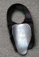 While the rawhide is wet and rubbery, cut out two matching pieces a little larger than a silver dollar. Cut a hole in one about the size of a dime. |