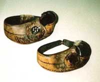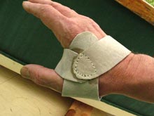 Next, I wrapped the "y" pattern around my hand; the two short tabs around my thumb, the long tab around the back of my hand to meet them. When I decided the fit was right, I glued them in place with contact cement. I know, they didn't have contact cement in the good old days, but if they did they would have used it. It makes it so much easier to hold things in place while doing the final fastening. I sewed mine, as you can see in the earlier pictures, but you could also use copper rivets from the hardware store or simple lacings. I made the fit fairly snug, figuring the leather will stretch over time. I also made the leather of the "y" piece rather wider than it needs to be, but I just like it that way.