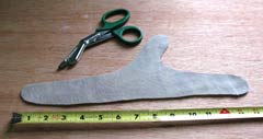 It took a little fiddling to come up with a pattern that works. Some palms, as you can see, simply have a hole cut for the thumb. Others wrap around the thumb in a more ergonomic manner. That's what I wanted. I took some paper and a pair of scissors and doodled around free-style until I came up with a pattern that looks like a "y".