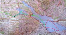 This is the tour around the Lake of Constance, with the camping grounds in black. The Bridge Over Troubles Water with lots of commercial and recreational traffic is right at Constance, in the middle. |