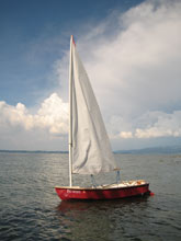 I choose the B&B Spindrift 11 N, built the boat within one year and had to learn that building a nesting hull is nearly as much work as building two dinghys. An attempt to cruise the whole lake and down the Rhine river to Schaffhausen in 2007 was hampered by bad health of the skipper –who had a flu- and the bad shape of the boat, which was not built exactly to the specifications of the designer.