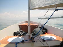 The first day, direction Arbon. Note the cleats for halyard and boom vang on the deck near the centreboard. The plans show some easier options. |