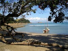 It was another perfect sunny day, and once again we anchored ‘fore and aft’ and went ashore for a brew up in the shade of one of the overhanging Pohutukawa trees. |