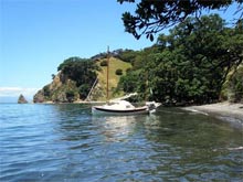 Another peaceful night aboard, and another beautiful day to greet us in the morning. With little wind likely until the afternoon, we set off after breakfast motoring towards the Waiheke Channel. We have sailed through here on several occasions, but have never had a close look at the many bays up this Eastern side of Waiheke Island, so this is what we planned to do. We motored slowly up the coastline where many of the bays are privately owned and have large houses with their own jetties and superb views of this beautiful area. At the northern end of the channel is Man O’War Bay, which is described in my cruising guide as ‘the perfect anchorage’. Well maybe, but not for us. There were dozens of boats already at anchor here, and, with a reasonable breeze now blowing down the channel we set off to find our own perfect anchorage in one of the little bays dotted down the Eastern coastline of Ponui Island. The Eastern side of Waiheke Channel is formed by three islands, Ponui, Rotoroa and Pakatoa. We sailed down between Pakatoa and Rotoroa Islands and on to Ponui. This coastline is foul with reefs and rocks, but between them are picturesque little sandy bays that are usually deserted. We found one to our liking not far past the Northern end of the island, and decided that we would spend the night here.
